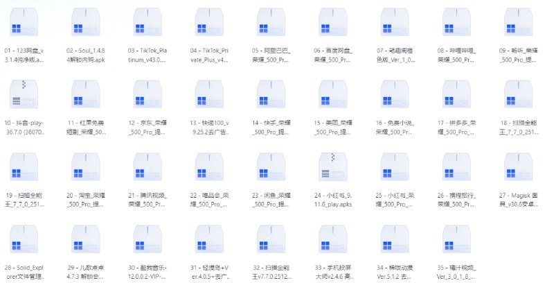 01 - 123网盘_v3.1.4纯净版 02 - Soul_1.4.84解锁内购 05 - 阿里巴巴_荣耀_500_Pro_提取版_v11_51_0_105 06 - 百度网盘_荣耀_500_Pro_提取版_v11_43_77 07 - 笔趣阁橙色版_Ver_1_0_9_去广告版 08 - 哔哩哔哩_荣耀_500_Pro_提取版_v6_56_0 09 - 畅听_荣耀_500_Pro_提取版_v5_5_0_46 10 - 抖音-play-36.7.0 (360700 29 - 儿歌点点 4.7.3 解锁会员版 30 - 酷我音乐-12.0.0.2-VIP-v8a 32 - 扫描全能王v7.7.0.251202高级版 33 - 手机投屏大师v2.4.6 高级版 35 - 橘汁视频_Ver_3_0_1_8_去广告_修复v2版