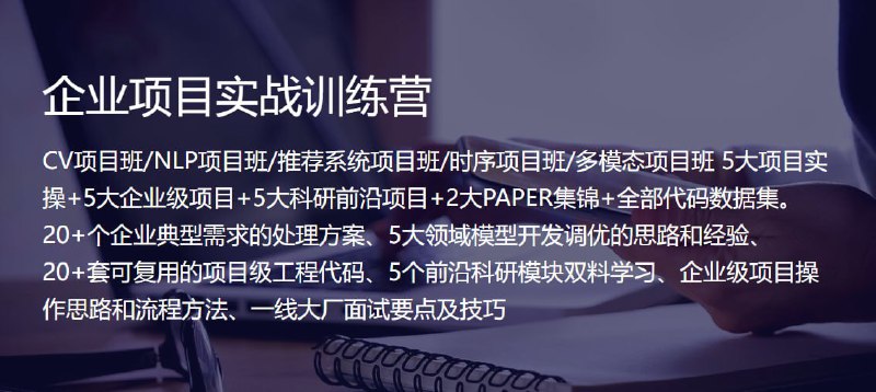 CV项目班/NLP项目班/推荐系统项目班/时序项目班/多模态项目班 5大项目实操+5大企业级项目+5大科研前沿项目+2大PAPER集锦+全部代码数据集。 20+个企业典型需求的处理方案、5大领域模型开发调优的思路和经验、20+套可复用的项目级工程代码、5个前沿科研模块双料学习、企业级项目操作思路和流程方法、一线大厂面试要点及技巧