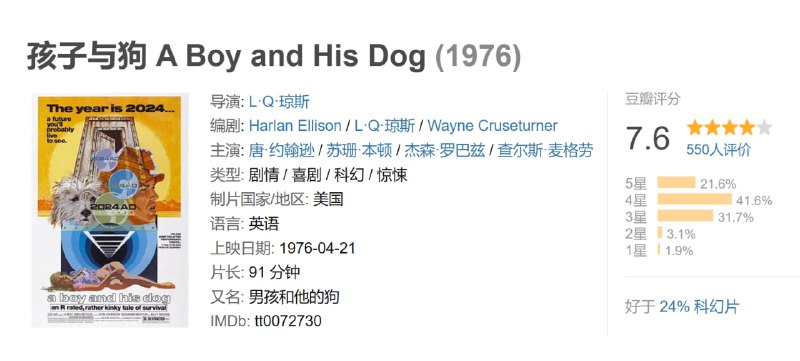 七十年代经典科幻片。公元2024年,核战后的废土上,一个男孩Vic和他的狗Blood相依为命,他们能通过心灵感应交谈。男孩被一个女孩引诱,误入地底深处一个奇异的反乌托邦社会。最终,他需要在女孩和狗之间做出抉择……