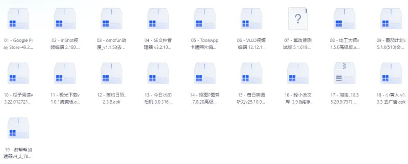 01 - Google Play Store-49.2.33-31.apk 02 - InShot视频编辑 2.180.1518专业版.apk 03 - omofun动漫_v1.1.53去广告版.apk 05 - ToonApp卡通照片编辑_3_1_47专业版.apk 06 - VLLO视频编辑 12.12.16高级版.apk 07 - 篡改猴测试版 5.1.6194.crx 08 - 电工大师v1.5.0高级版.apk 09 - 番茄计划v5.1.0(510)会员版.apk 10 - 瓜子阅读v3.22.012721去广告版.apk 11 - 极光下载v1.0.1清爽版.apk 14 - 抠图P图秀_7.8.20高级版.apk 15 - 每日英语听力v25.10.0会员版.apk 19 - 游帮帮加速器v4_2_7892_免广奖励版.apk