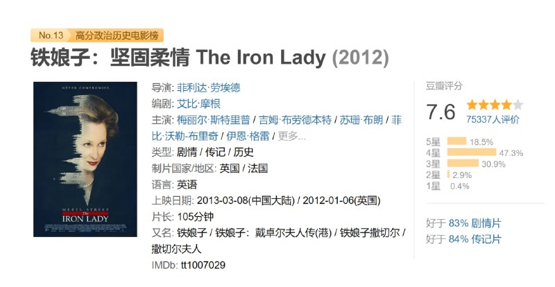 耄耋之年的撒切尔夫人(梅丽尔•斯特里普 Meryl Streep 饰)罹患老年痴呆症,时常在幻觉和回忆中切换。她感觉深爱的丈夫一直在身边陪伴,其实后者早已亡故。她作为杂货店的女儿,因为出身贫寒,时常饱受世人的白眼。然而,在聆听了保守党的演讲后,她坚定了自己的政治信仰,并以优异成绩考入牛津大学,虽然在一次议员选举中落败,但是她却收获了真挚的爱情与他相伴,坚定了自己从政的人生道路。从此,她逐渐走到了保守党魁的位置。终于,保守党在选举中大胜,而她也成为了英国历史上第一位女首相,组建了自己的内阁政府。面对纷繁复杂的国际国内局势,她力主的自由市场政策也饱受非议,但是她用过人的智慧和超强的忍耐力,战胜了左辅右弼众叛亲离的局面,凭一己之力拯救了英国经济,捍卫了领土主权,被世人称作铁娘子……