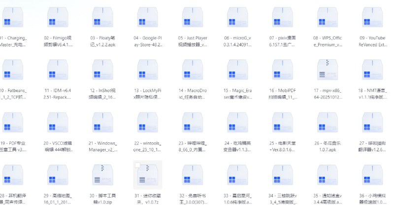 01 - Charging_Master_充电自动化大师_v5_33_32.apk 02 - Filmigo视频剪辑V6.4.1.0高级版.apk 03 - Floaty笔记_v1.2.2.apk 12 - InShot视频编辑_2_160_1508专业版_Mixroot.apk 13 - LockMyPix照片隐私保护_6_0_0_1D_Gemini高级版_Mixroot.apk 14 - MacroDroid_任务自动化v5_57_6绿化版.apk 16 - MobiPDF扫描编辑_11_10_267377高级版_Balatan.apk 19 - PDF专业签章工具 v3.6.exe