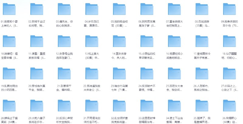 01.别惹那个要上岸的人(81集)刘雨昊&林柒予 02.财阀千金订台找茬,我点满神技(80集)刘博威&知意 03.傅先生,你的心跳我承包了(100集)杨晨(女)&刘渝展 04.岁月忽已暮,潇潇归来时(100集)彭剑雄&刘欣悦 05.我的极品校花(80集)刘抒航&张婉悦 06.网购男友竟是孩子爹(82集)黄子淇&张乙萌 07.重生换嫁大佬把我宠上天(60集)王亨宇&周沁桐 08.在线追踪(35集)马晓伟&翁心 09.我身体里的那个他(70集)王奕然&张晋宜 10.换婚吧!姐宝要幸福(81集)卢东旭&彭瑶 11.谋凰!重振家族荣耀(60集)王嘉懋&李曼妮