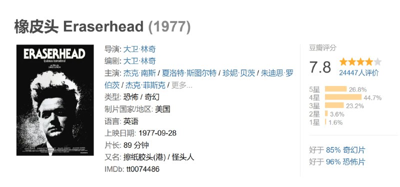 阴暗压抑的工业小镇,刺耳的机器轰鸣噪音。亨利•斯班瑟(杰克·南斯饰)初次拜访女友家,然而目睹到的却是一个怪异扭曲的家庭,霸道的母亲、无能的父亲、植物人似的祖母以及笨拙的女儿。而更令亨利感到无助的是,他被迫与女友结婚。一夜之间,亨利成为一个畸形儿的父亲。相貌丑陋恶心的婴儿让亨利异常恐惧焦虑,也让新婚妻子因忍受不了婴儿的啼哭而半夜出逃。亨利再也忍受不了如此不堪的生活和夜夜噩梦,他最终亲手用剪刀肢解掉了这个畸形的早产儿。 由美国电影新浪潮运动旗手大卫·林奇创作的首部长片《橡皮头》,历时五年完成。一经公映,便以强烈的前卫诡异风格挑战了当时还相当传统和保守的电影界。在情绪化的摇晃镜头与随处可见的阴暗腐败中,大卫·林奇构筑出了一幅扭曲病态的家庭人物关系,赤裸裸地破开人性的阴暗面。这种运用弗洛伊德心理分析,来剖析人类精神世界中焦灼郁闷的手法,加上极具视觉冲击力的影像,让大卫·林奇在影坛独树一帜。
