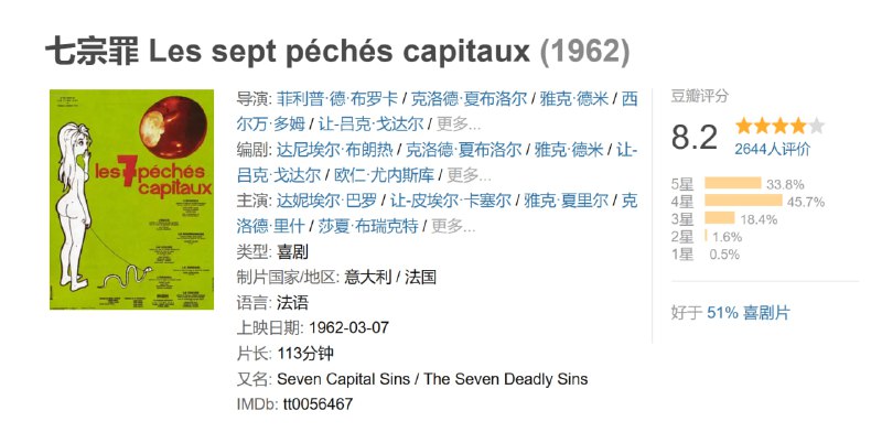 愤怒、嫉妒、暴食、好色、懒惰、虚荣、小气,这七宗罪历来被很多国家电影人搬上银幕,最新的也许是那个美国版本,而最经典的,可能就是这部1962年的集锦片了。当时,法国新浪潮的旗帜刚刚举起,很多新晋导演还没能够充分展示自己的实力,这样一部集合众多人才的短片集锦无疑是向观众、也是向制片人展示自己的最好机会。 每个故事都紧扣主题,或者夸张或者讽刺或者幽默或者绝望,七个简单的名词,使影片先有了一半的戏剧性,接下来就要看导演的风格、兴趣和功力了。大概是出于商业目的,影片中大部分都是喜剧性的小故事,最夸张的莫过于由欧洲现代戏剧大师尤内斯库编剧、协助导演的“愤怒”故事,各种夸张笑话都集合在这部导演明星荟萃的超级大拼盘里。