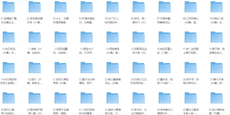 01.剧情崩了真校花竟恋上炮灰(78集)罗甦杨&黄颖琪 02.签到系统撩女神(61集)苗雨峤 03.什么,你竟然是首富爱妻(61集)虞彤彤&谢海青 04.手滑发错告白,总裁直接扛去领证(80集)王三北&盛佳琦 05.为了女儿,妈妈是战神(65集)苏嘉欣 06.宗师,我一掌拍飞(80集)明鹏&生宸 07.天降神童罪案系统已激活(80集)蒋开鑫 08.江月照福心(86集)蓝博&李林汐 09.诱她入局(80集)刘擎&白妍 10.昨日茶花(56集)许炎磊&黄思宇 11.诡舍(56集)赵志伟&王佩寒