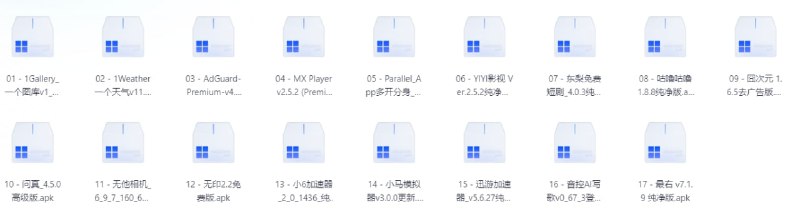 01 - 1Gallery_一个图库v1_2_0_5_251225高级版.apk 02 - 1Weather 一个天气v11.9.5高级版.apk 03 - AdGuard-Premium-v4.14.33.apk 04 - MX Player v2.5.2 (Premium)纯净版.apk 05 - Parallel_App多开分身_5_8_2解锁会员.apk 06 - YIYI影视 Ver.2.5.2纯净版.apk 07 - 东梨免费短剧_4.0.3纯净版.apk 08 - 咕噜咕噜1.8.8纯净版.apk 09 - 囧次元 1.6.5去广告版.apk 10 - 问真_4.5.0高级版.apk 11 - 无他相机_6_9_7_160_697697会员版.apk