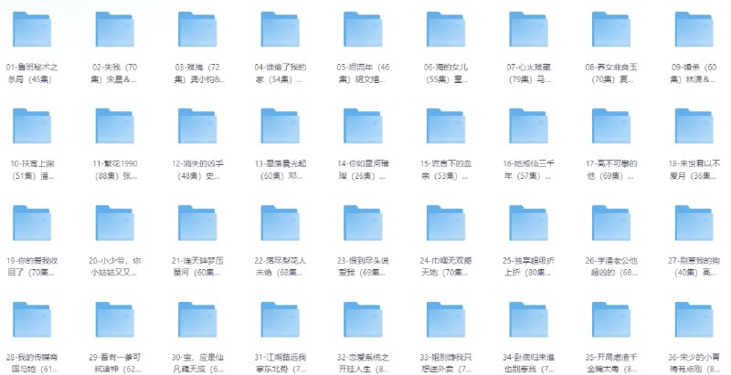 01-鲁班秘术之杀局(45集) 02-失我(70集)宋晨&程琳苗 03-难掩(72集)龚小钧&李文瑞 04-谁偷了我的家(54集)马倩倩 05-烬流年(46集)胡文煊&万雨晗 06-海的女儿(55集)童欣&安奕明 07-心火难藏(79集)马浩东&时一 08-养女非良玉(70集)夏末&王辉 09-婚杀(60集)林潇&张张(张玉娇) 10-扶鸾上渊(51集)潘彦妃&迟立国 11-繁花1990(88集)张亚迪&王亨宇