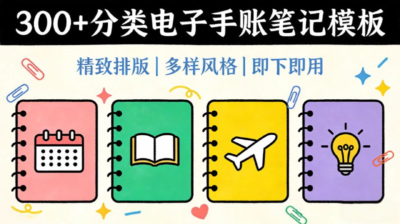300+套分类电子手账笔记模板,覆盖学习、工作、生活等多场景,如康奈尔笔记、错题本、打卡表、观影记录和理财规划。提供复古、古风、简约等多种风格,PDF格式兼容iPad及主流笔记软件。
