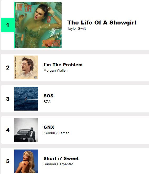 NO.001 - Taylor Swift - The Life of a Showgirl NO.002 - Morgan Wallen - I’m The Problem NO.003 - SZA - SOS NO.004 - Kendrick Lamar - GNX NO.005 - Sabrina Carpenter - Short n' Sweet