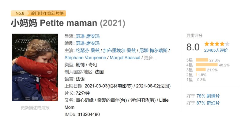 母亲的身影,总是这麽近,又那麽远。外婆去世,八岁的奈莉随妈妈回旧居收拾,但大人哀伤的世界却容不下孩子走进。与爸爸相依的奈莉独自走到森林寻找妈妈儿时搭建的树屋,遇上同龄的玛莉安,名字跟母亲一样,两人开展了一段短暂而亲密的友谊。 继《燃烧女子的肖像》(2019)后,瑟琳·席安玛以细腻的女性触觉,潜入小孩敏感而脆弱的内心,在如幻似真的童梦里任时空暗换,与新相识相知相遇,分享悲喜哀乐,实现每个孩子心里都曾有过的美丽童话。如何去爱那个不完美的人生。