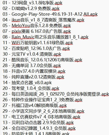 21 - 酷我音乐_12.0.6.1(12061)高级版.apk 11 - WiFi万能钥匙v1.1.61绿色版.apk 18 - 抖音v37.4.0 内置双模块.apk 16 - 纯粹直播v2.0.12清爽版.apk 14 - 抽奖点名器_v8.0.apk 29 - 小学语文同步学_2_6_2本地高级版.apk 23 - 每日英语阅读_26_1_029270_会员纯净版需登录.apk 27 - 托福口语v4.0解锁高级版.apk 17 - 电工仿真软件v7_4_0本地高级版.apk 20 - 驾考堂_1.0.4_会员版.apk