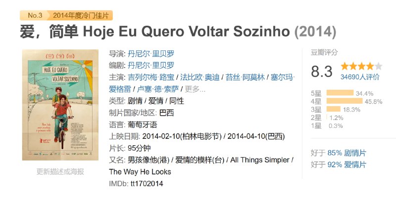 爱,简单 Hoje Eu Quero Voltar Sozinho (2014)
