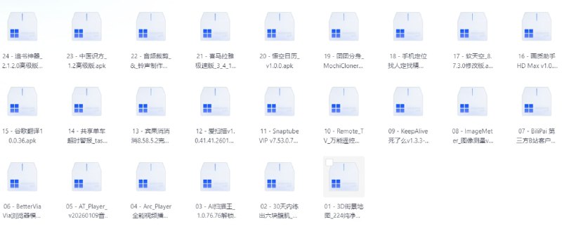 24 - 追书神器_2.1.2.0高级版.apk 23 - 中医识方_1.2高级版.apk 17 - 软天空_8.7.3.0修改版.apk 02 - 30天内练出六块腹1_4_4专业版.apk 01 - 3D街景地图_224纯净版.apk 03 - AI扫描王_1.0.76.76解锁高级版.apk 05 - AT_Player_v20260109音乐下载器专业版.apk 09 - KeepAlive 死了么v1.3.3-lite.apk 18 - 手机定位找人定找精灵8_6_6高级版.apk 21 - 喜马拉雅极速版_3_4_10_310072会员版.apk