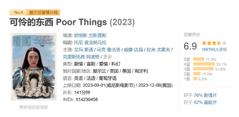 影片基于苏格兰作家阿拉斯代尔·格雷所著同名小说,融合现实主义、奇幻、科幻元素,将弗兰肯斯坦的故事重塑,设定在维多利亚时代晚期,逃避丈夫虐待却不幸身亡的女子贝拉(艾玛·斯通 Emma Stone 饰),在被科学家成功复活后,心智停留在孩童阶段,却也对未知世界充满渴望;她与放荡律师私奔踏上挖掘自我的冒险,试图摆脱时代对女性偏见,追求平等与性解放。