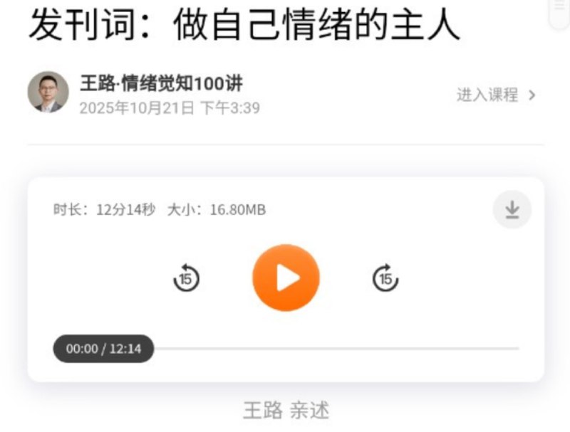 《王路·情绪觉知100讲》是一门深度结合认知科学、心理学与社会学的情绪管理课程。其核心并非提供简单的情绪控制技巧,而是引导学员进行“情绪觉知” ——即深入理解情绪产生的底层机制、社会文化背景及其对行为模式的深远影响。课程内容广泛覆盖成瘾、焦虑、抑郁、压力、愤怒、羞耻、内疚、孤独、拖延、注意力等核心议题,并从独特视角剖析日常现象(如暧昧吸引力、安慰无效性、过度夸奖危害)。课程特点在于“跳出情绪看情绪” ,既探讨生理基础(如皮质醇、腺苷),也分析心理模式(反刍、显化),更审视社会建构(象征资本、痛苦外包),最终帮助学员建立一套理性的情绪观察与解读系统,从而摆脱被情绪无意识操控的状态,真正成为自己情绪的主人,实现更清醒、自主的生活。