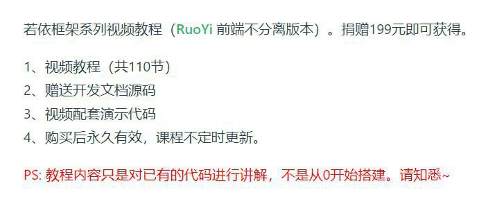 若依框架系列视频教程(RuoYi (opens new window)前端不分离版本)。捐赠199元即可获得。