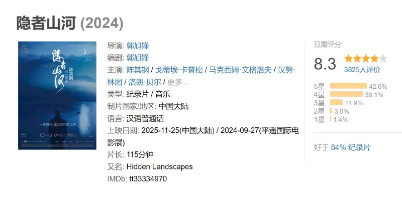 《隐者山河》是一部深入作曲家陈其钢精神世界的艺术传记电影。影片历时七年跨国拍摄,以沉浸式的视听语言,记录下数十位世界级音乐家演绎其作品的珍贵现场,堪称一场顶级的视听盛宴。 然而,影片远不止于音乐。它更以散文诗般的笔触,刻画了陈其钢从国际舞台隐退,选择“忙世人之所闲,闲世人之所忙”的独行之路。影片深刻探讨了他在中西方文化碰撞中,如何坚守自我,最终“一意孤行,走回自己的世界”的精神突围。 这既是一位艺术家的心灵史,也为所有在喧嚣时代中寻求自我的人,提供了一份深刻的映照与笃定的力量。11月25日,于全国艺联专线,诚邀您共赴这场涤荡心灵的光影之约。