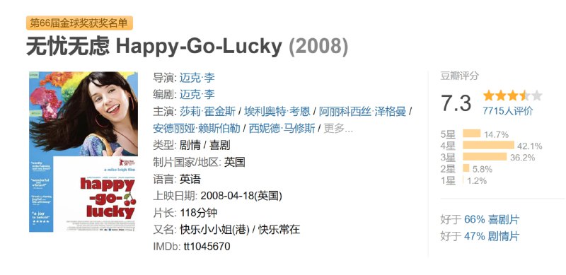 波皮(莎莉·霍金斯 Sally Hawkins 饰)已经三十岁了,她是个普通的小学教师,没有房子,没有存款,仍旧单身,不再年轻也就不再漂亮……但是与沮丧现实相反的,是波皮极端乐观的个性,她明媚开朗得像涉世未深的孩子,甚至在一些外人眼里亢奋得不大正常。她练习蹦床,却遭到肌 肉拉伤,方知自己年龄已经不适合这项运动,只好改学弗拉门戈舞;她去学车打算考驾照,却因为表现得太过活泼亲热,引来严肃的学车教练斯考特(艾迪·马森 Eddie Marsan 饰)愤怒爆发,认为她在挑逗他……波皮“无忧无虑”的性格,不符合年龄的乐观,似乎已经与周围的一切格格不入……