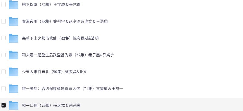 1.榜下捉婿(82集)王宇威&张艺霖 2.春港夜雨(68集)姚冠宇&赵夕汐&淮文&王浩翔 3.高手下山之都市修仙(80集)陈彦霖&陈清玥 4.和夫君一起重生后我登基为帝(52集)秦子墨&乔婉宁 5.少夫人来自东北(80集)梁雯晶&业文 6.唯一奢想合约保镖竟是真命大佬(71集)甘望星&田甜一 7.咬一口糖(75集)任运杰&莉莉崽