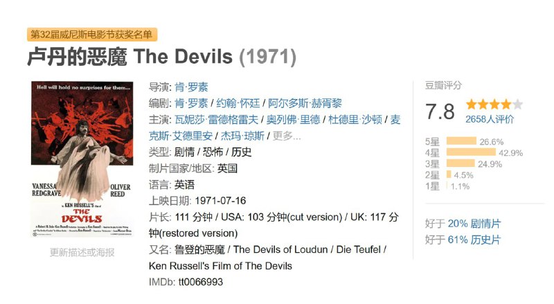 肯·罗素(Ken Russell)根据约翰·惠廷(John Whiting)1961年的RSC戏剧改编,原作为阿道司.赫胥黎(Aldous Huxley)于1952年进行的卢丹冤案的研究。 影片主要内容是发生在17世纪法国,个人自由主义色彩浓厚的乌尔班·格兰迪神父(Ur bain Grandier)顶撞到了天主教枢机黎塞留公爵的权威,从而导致公爵和教会开始共谋如何利用修女被“恶魔”附身这一借口来陷害神父,最终导致悲剧发生。 这部电影虽然有很多大胆惊人的地方,但不妨碍其成为英国电影中独特且具有里程碑意义的影片。
