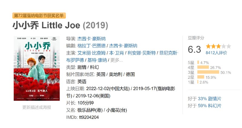 爱丽丝,是一个单身母亲,也是一家新品种植物开发公司的高级植物培育员,工作非常勤奋。她设计了一种非常特别的暗红色花朵,不仅外观让人注目,其健康价值更是出众如果气温合适,营养足够,人们能时常跟它说话,这棵植物就可以让它的所有者开心起来。爱丽丝违反了公司规定,带了一株回家送给自己的青少年儿子,乔。他们给这朵花起名“小小乔”。但随着花朵生长,爱丽丝越来越怀疑“小小乔”也许并不像它的名字那么无邪。