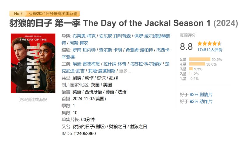 本剧基于Frederick Forsyth的同名小说和1973年同名改编电影创作。 “豺狼”(埃迪·雷德梅恩 Eddie Redmayne 饰)是一个无与伦比、难以捉摸的独行杀手,他以执行高报酬的刺杀任务为生。处于“豺狼”私人生活中心的Nuria(乌苏拉·科尔维罗 Úrsula Corberó 饰)对他的身份却一无所知。在最近一次杀人后,“豺狼”遇到了自己的对手,顽强的英国情报探员Bianca(拉什纳·林奇 Lashana Lynch 饰)。Bianca开始在欧洲各地追捕“豺狼”,一场惊心动魄的猫鼠追逐战由此展开,随之而来的是一连串的破坏。