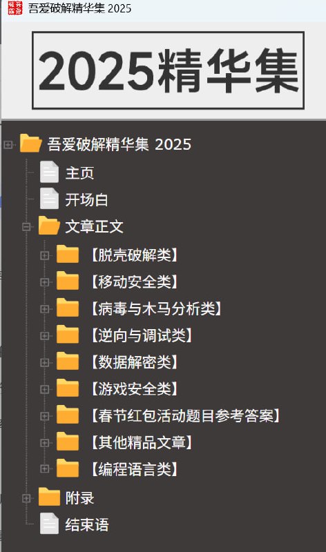 《吾爱破解精华集 2025》是吾爱破解论坛年度精华文章的合集,涵盖逆向工程、漏洞分析、移动安全、病毒分析、游戏安全等多个领域。全书分为脱壳破解、移动安全、病毒与木马分析、逆向与调试、数据解密、游戏安全等大类,收录了vMProtect分析、Frida持久化、iOS/Android逆向、勒索软件解锁、游戏保护绕过、Web JSVMP还原、IoT漏洞挖掘等实战案例。同时包含春节红包解题专题,提供多平台题解与思路。附录部分整理了论坛入门导航、工具资源及历年精华索引。本书内容硬核、案例丰富,是网络安全爱好者与逆向工程师的年度必读参考资料。