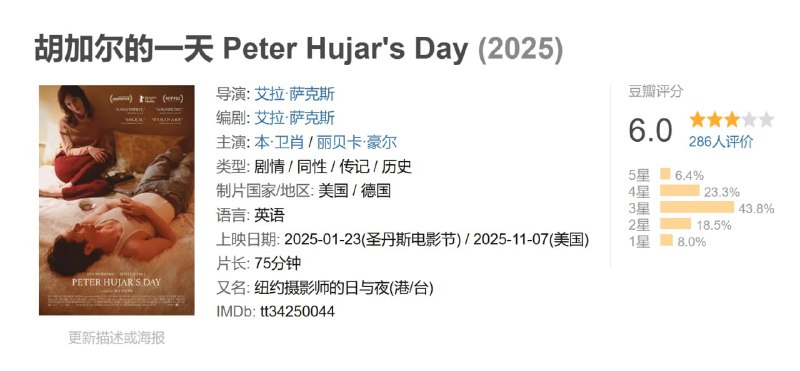 说来平平无奇,奇在竟煞是好看。娓娓道来自己过去一天的是新锐摄影师彼得胡渣,请他到香闺畅谈的是知名作家莲达罗森克兰兹。本打算将纽约艺术圈好友的生活日常结集成书,书出不成,抄本却奇迹留下,让埃拉萨克斯看得心神一动,在一室之内以灵巧多变的镜头摆位,重塑1974年那平凡却奇妙的一天。请来《欲流双行道》的宾韦沙念55页独白,三分型格三分忧郁再带三分初成名的忐忑。漫溢于16米厘的光影质感之间,是安迪华荷、苏珊桑塔格那一代人浸透于生活的艺术灵光。