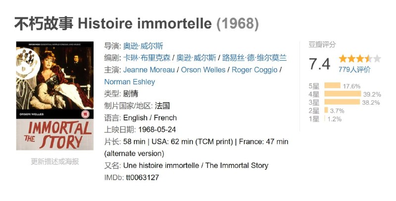 威尔斯唯一一部公映的彩色电影,故事依旧奇情澳门富商从秘书口中听到一个爱情传说,有人为了香灯有后愿意付钱找人与妻子上床。传说归传说,但澳门富商却要使这个不朽故事成真,找来美女珍.摩露,当正是自己妻子,要她找人轰烈地做爱做的事。乍听下来真是一场天方夜谭,但影片拍来感人至深,53岁的威尔斯与成熟的珍.摩露演出动人不已,最后一个镜头更被影迷形容是「魔术」,令影片入围柏林国际电影节竞逐最佳电影金熊奖。